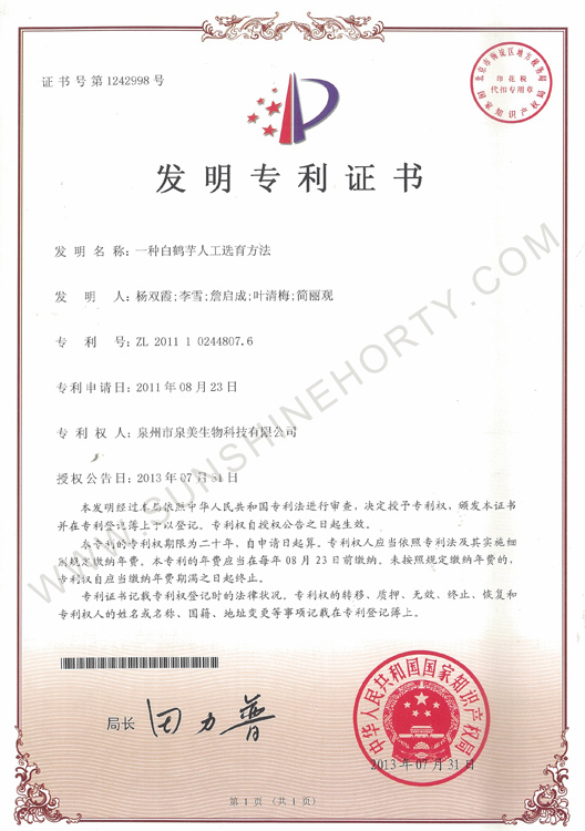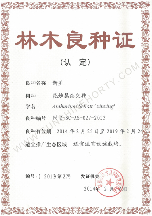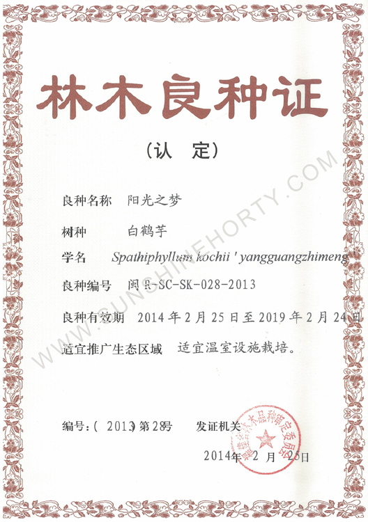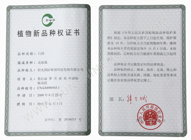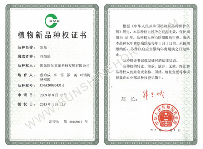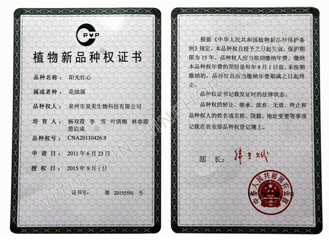公司先后申報(bào)了20多項(xiàng)專利,獲準(zhǔn)專利15個(gè),通過新品種省級(jí)認(rèn)定4個(gè)。自主選育的新品種“新星”紅掌、“紅心”紅掌獲農(nóng)業(yè)部新品種權(quán)保護(hù);“陽光之夢”,“陽光之戀”,“陽光之星”系列白掌新品種獲產(chǎn)品商標(biāo)保護(hù)。公司對(duì)自主知識(shí)產(chǎn)權(quán)進(jìn)行了有效保護(hù)。